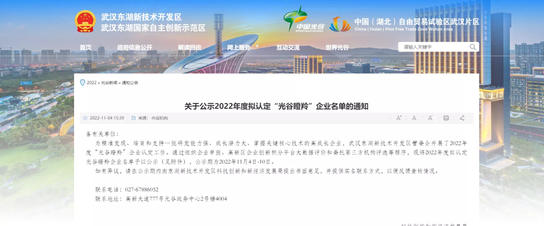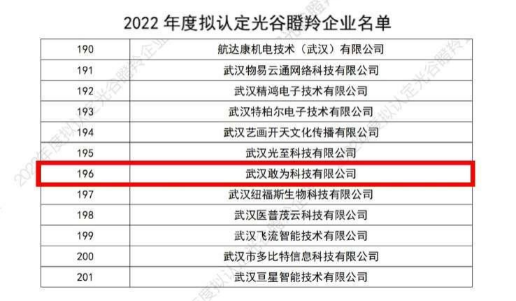 11月4日東湖新技術(shù)開(kāi)發(fā)區(qū)科技創(chuàng)新和新經(jīng)濟(jì)發(fā)展局發(fā)布了《關(guān)于公示2022年度擬認(rèn)定光谷瞪羚企業(yè)名單的通知》,武漢敢為科技有限公司成功獲評(píng)2022年度光谷瞪羚企業(yè),這也是敢為科技連續(xù)四年獲得此榮譽(yù)。