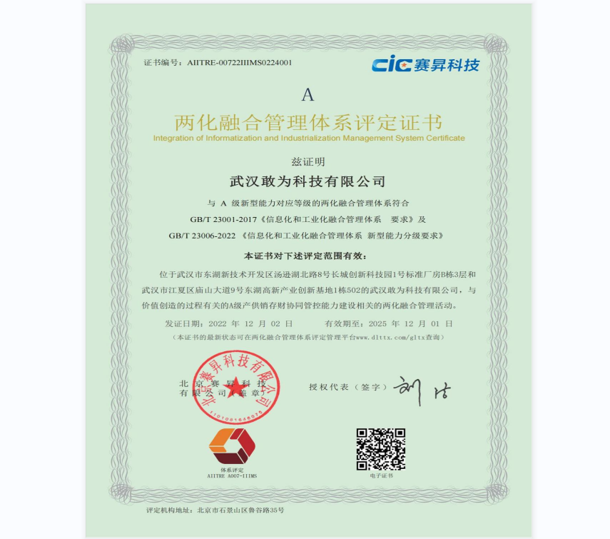 12月2日,武漢敢為科技有限公司正式通過信息化與工業(yè)化融合管理體系證書,取得“兩化融合管理體系A級評定證書?!北敬呜灅说捻樌ㄟ^,標志著武漢敢為科技在推進信息化與工業(yè)化深度融合方面獲得了權(quán)威認可,數(shù)字化轉(zhuǎn)型工作邁上新臺階。