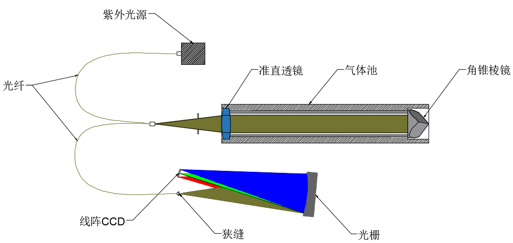 紫外光源發(fā)出的紫外光經(jīng)準(zhǔn)直透鏡準(zhǔn)之后進(jìn)入氣體池,經(jīng)樣氣吸收后的紫外光通過聚焦透鏡聚焦后耦合進(jìn)光纖并傳輸?shù)焦庾V儀中。經(jīng)過光柵分光、CCD接收光信號(hào)進(jìn)行光電轉(zhuǎn)換,得到待測(cè)氣體的紫外吸收光譜,通過對(duì)光譜進(jìn)行差分分析,并結(jié)合化學(xué)計(jì)量學(xué)算法及科學(xué)的數(shù)學(xué)模型,可以得出相關(guān)氣體成分的濃度。