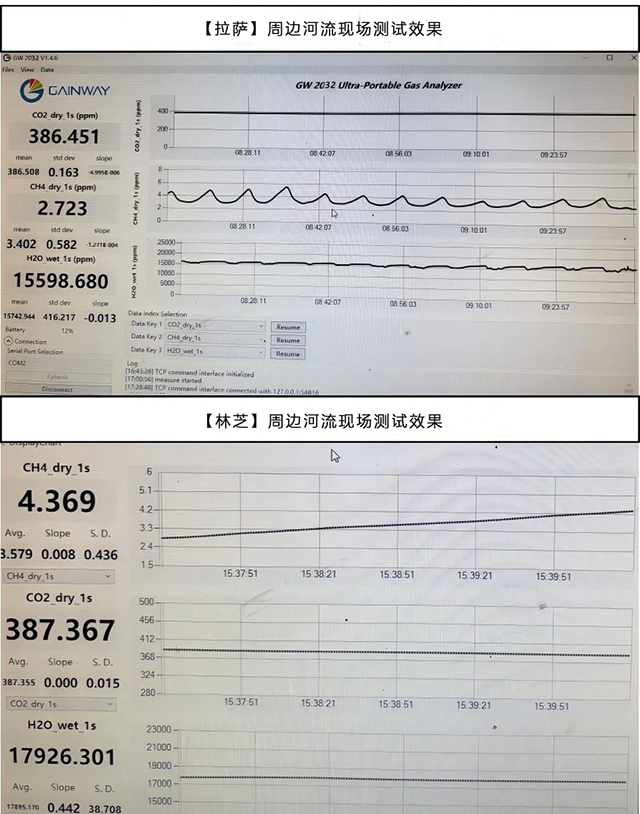 在2025年夏季和秋季,我們測試地點選擇了拉薩、林芝周邊河流進行了便攜式溫室氣體分析儀性能和水-氣界面溫室氣體通量測試。