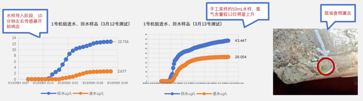 設(shè)備投入運(yùn)行后,通過實時在線監(jiān)測1號機(jī)定冷水含氫量,很快明確了漏氫現(xiàn)象,準(zhǔn)確地測量出氫氣泄露量,并參照《防止電力生產(chǎn)事故的二十五項重點要求》及時給出建議停機(jī)檢修的建議,成功地預(yù)警了滲漏缺陷及其進(jìn)一步影響。